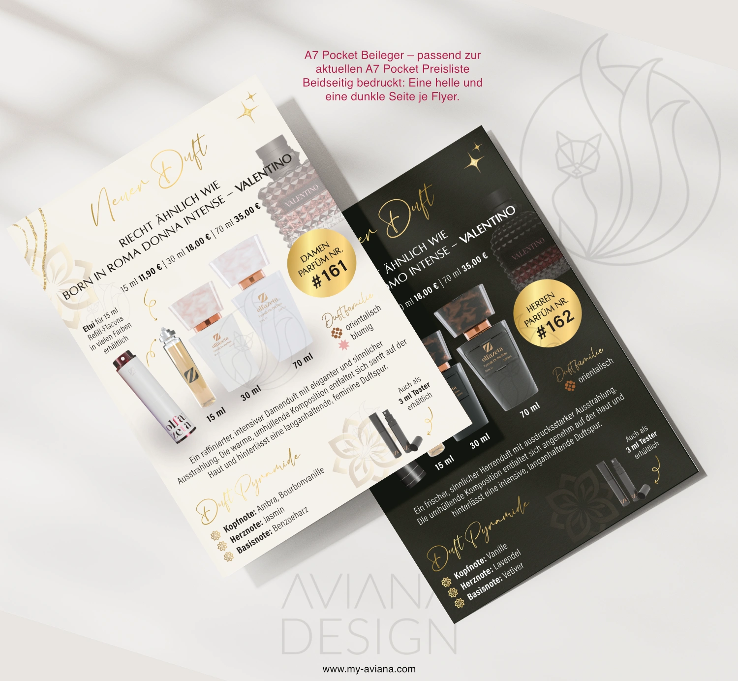 Keine Sorge, wenn dein Duftsortiment erweitert wurde und deine Preisliste noch nicht aktualisiert ist. Wir haben die perfekte Lösung für dich! Mit unseren einfach zu integrierenden Beilegern bleibt deine Preisliste immer auf dem neuesten Stand. Nutze die Beileger nicht nur zur Aktualisierung, sondern auch, um die neuen Düfte besonders hervorzuheben und effektiv zu bewerben.